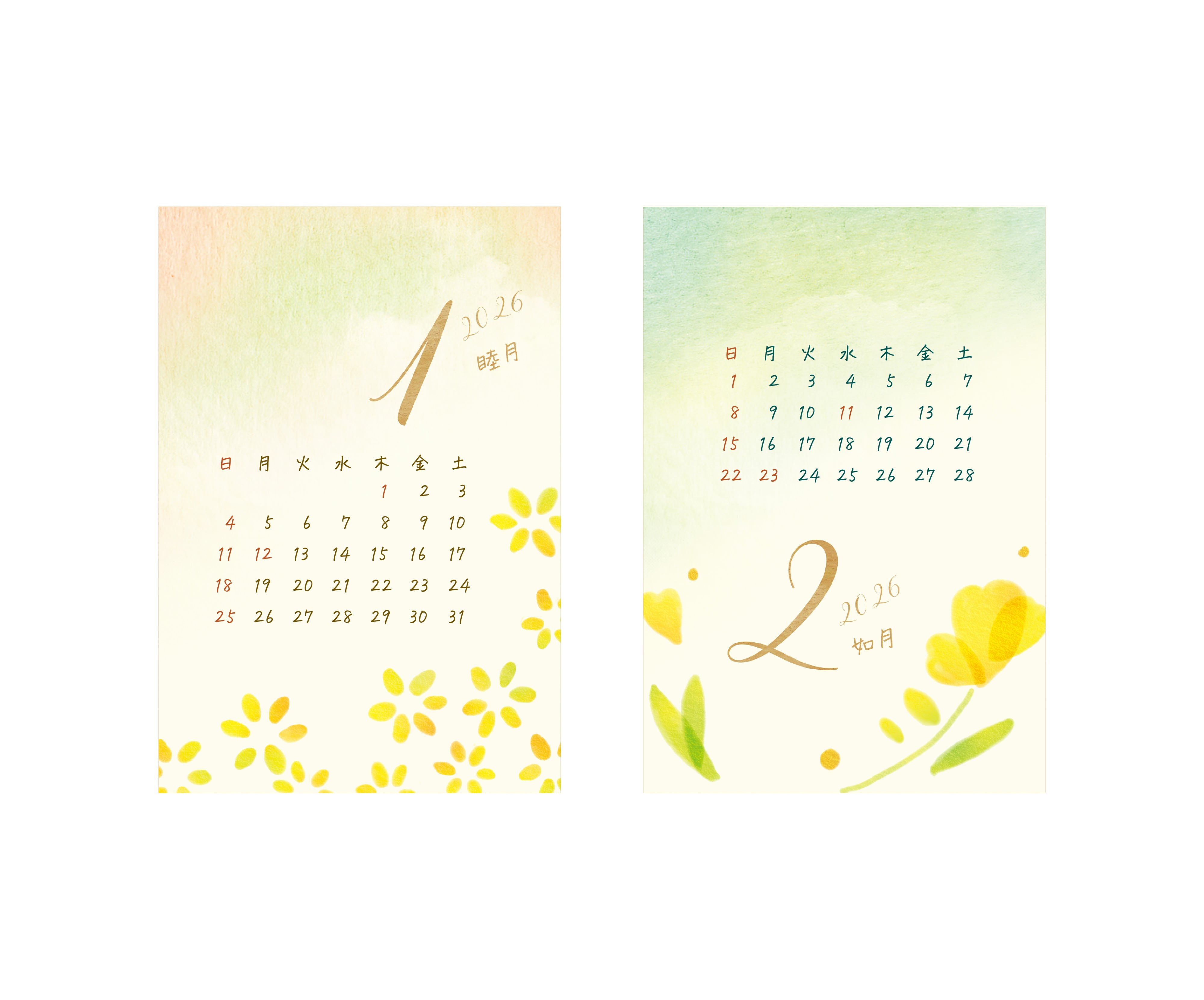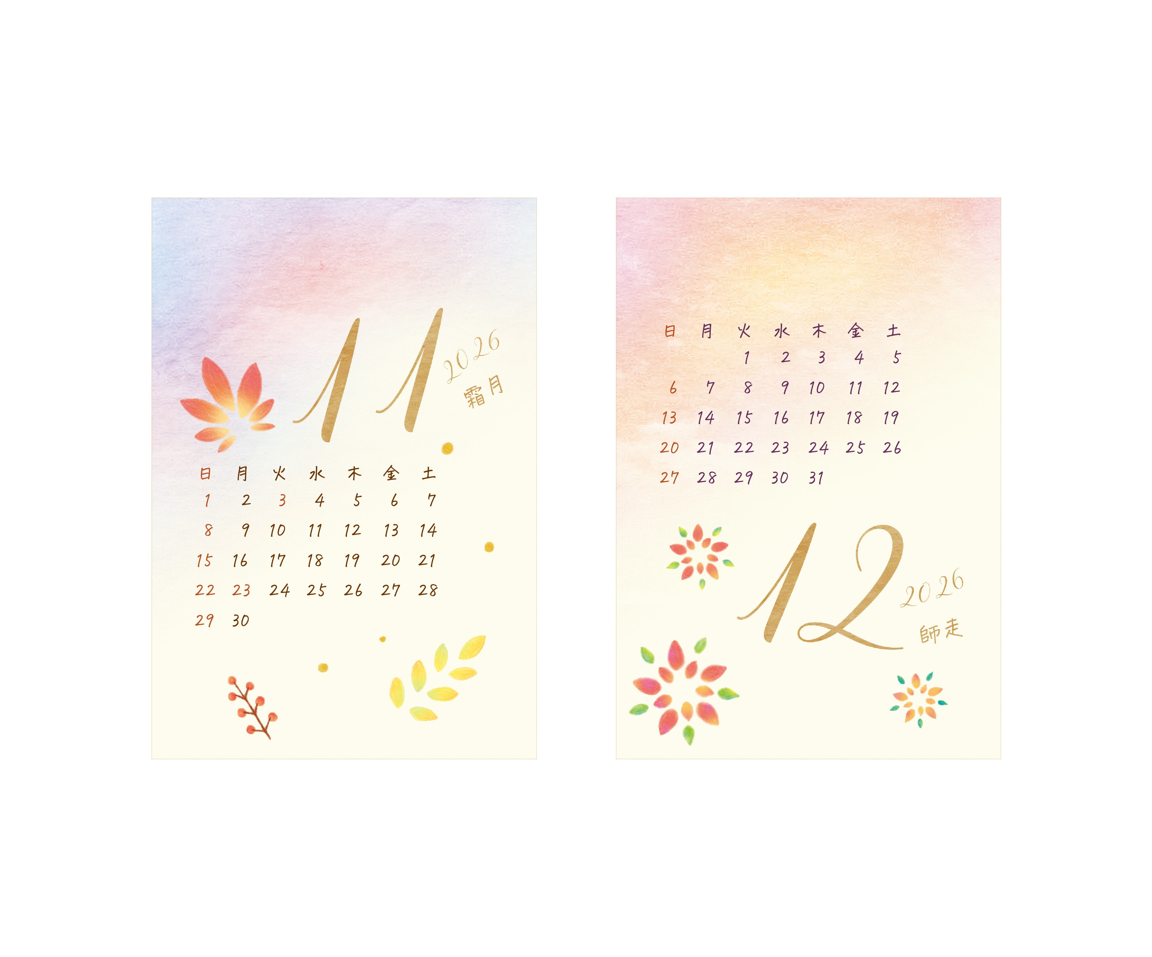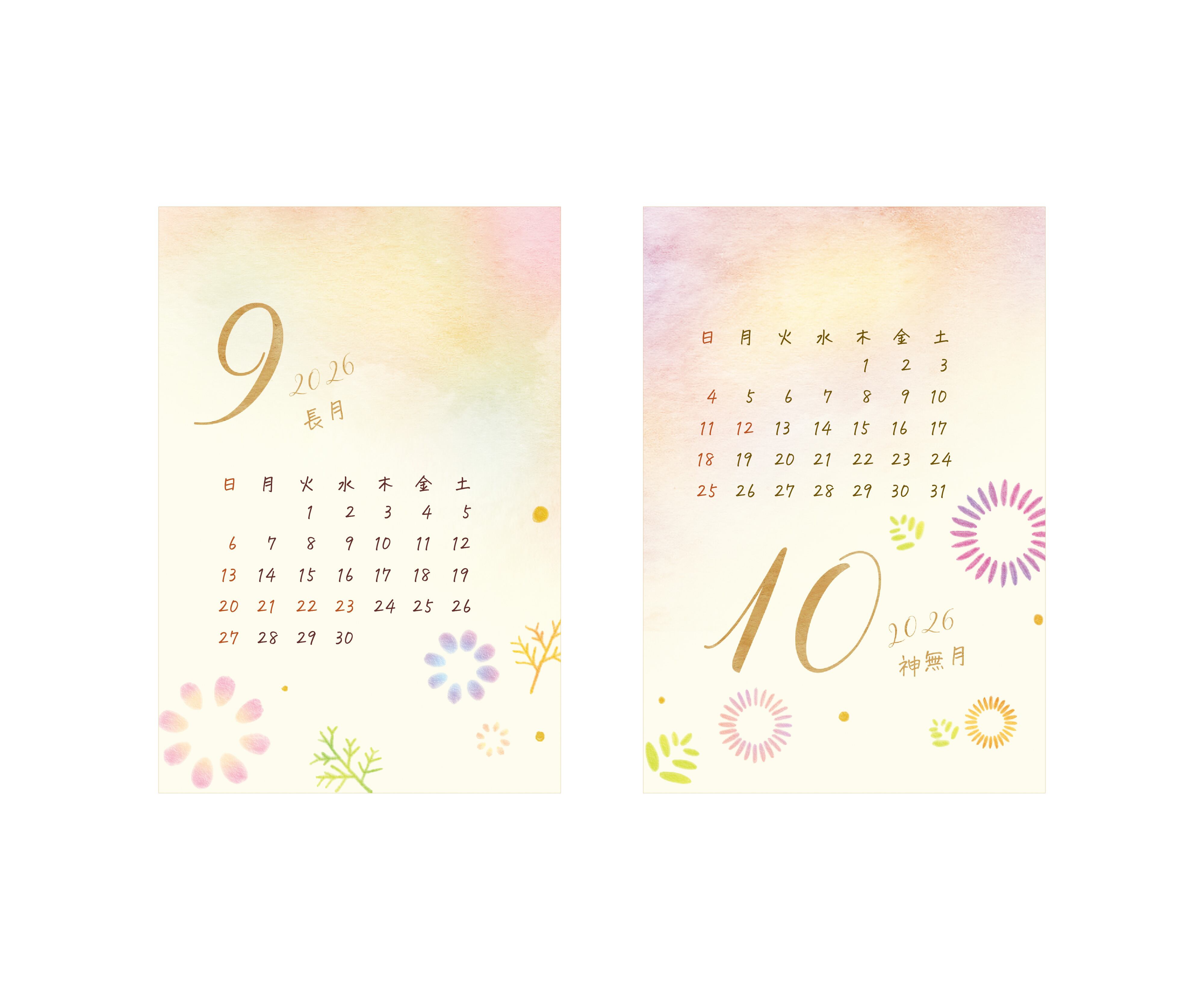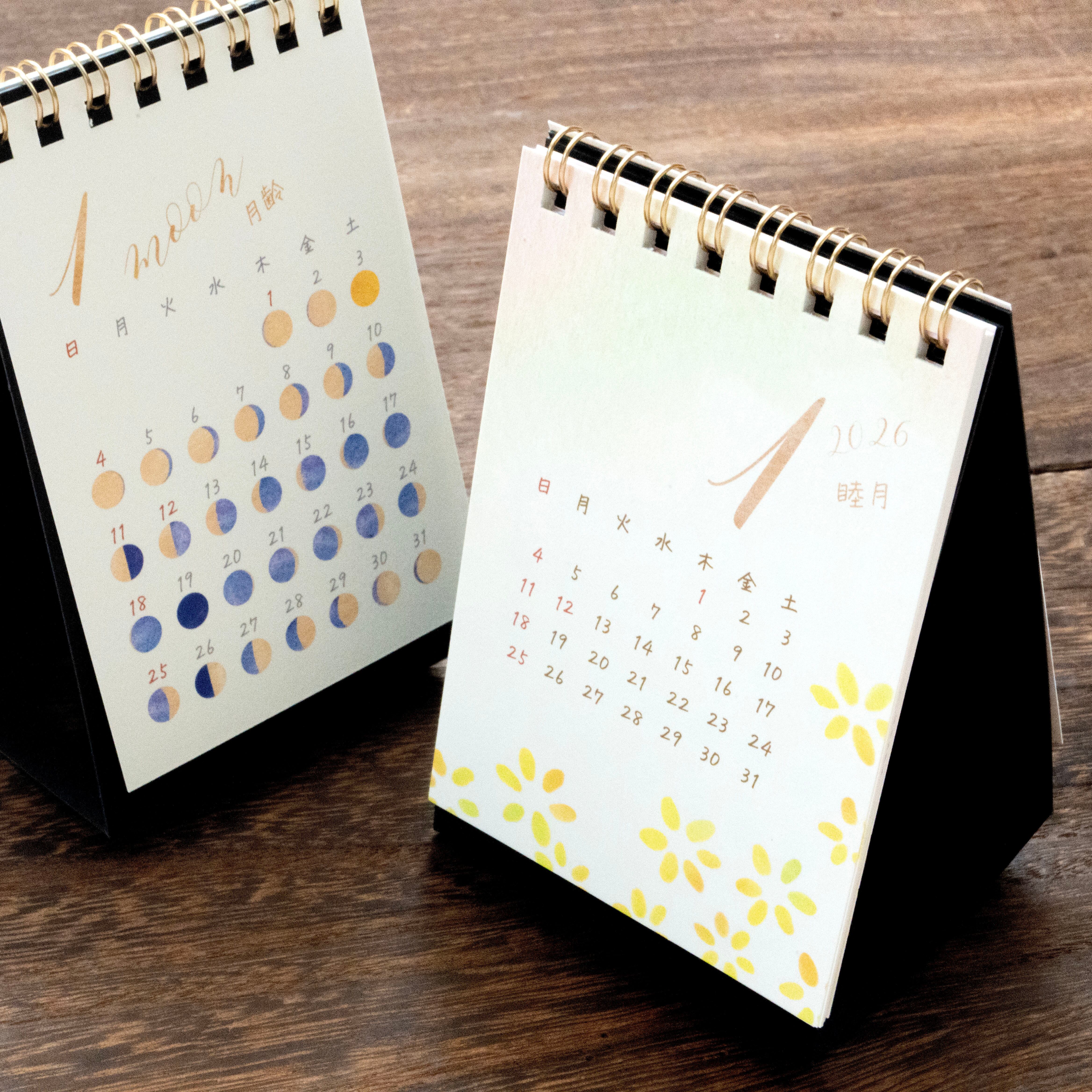 ・仕様:2026年1月〜12月までの毎月カレンダー、ダブルリング(ゴールド)、両面印刷